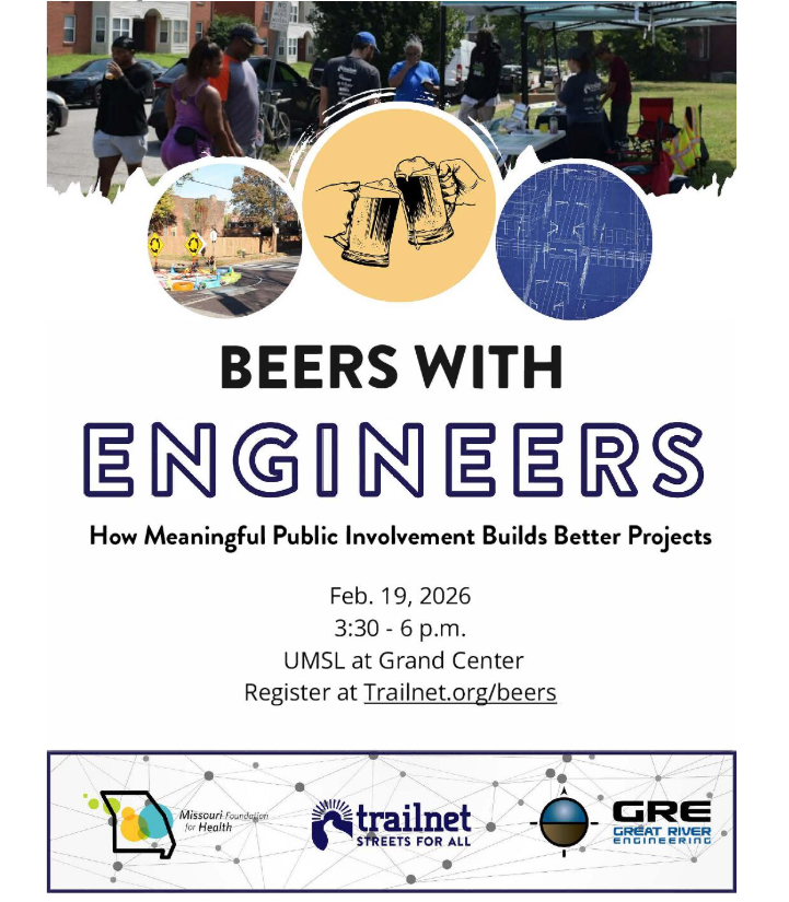 Trailnet invites you to Beers with Engineers: How Meaningful Public Involvement Builds Better Projects, an event crafted specifically for engineers, planners, landscape architects, designers, and development professionals with a passion for transportation! Taking place on Thursday, Feb. 19 at UMSL at Grand Center, Beers with Engineers will include an engaging panel, collaborative activities, networking, snacks, and — you guessed it — local beer and other beverages. The focus this year is the use of public involvement to develop more effective projects.