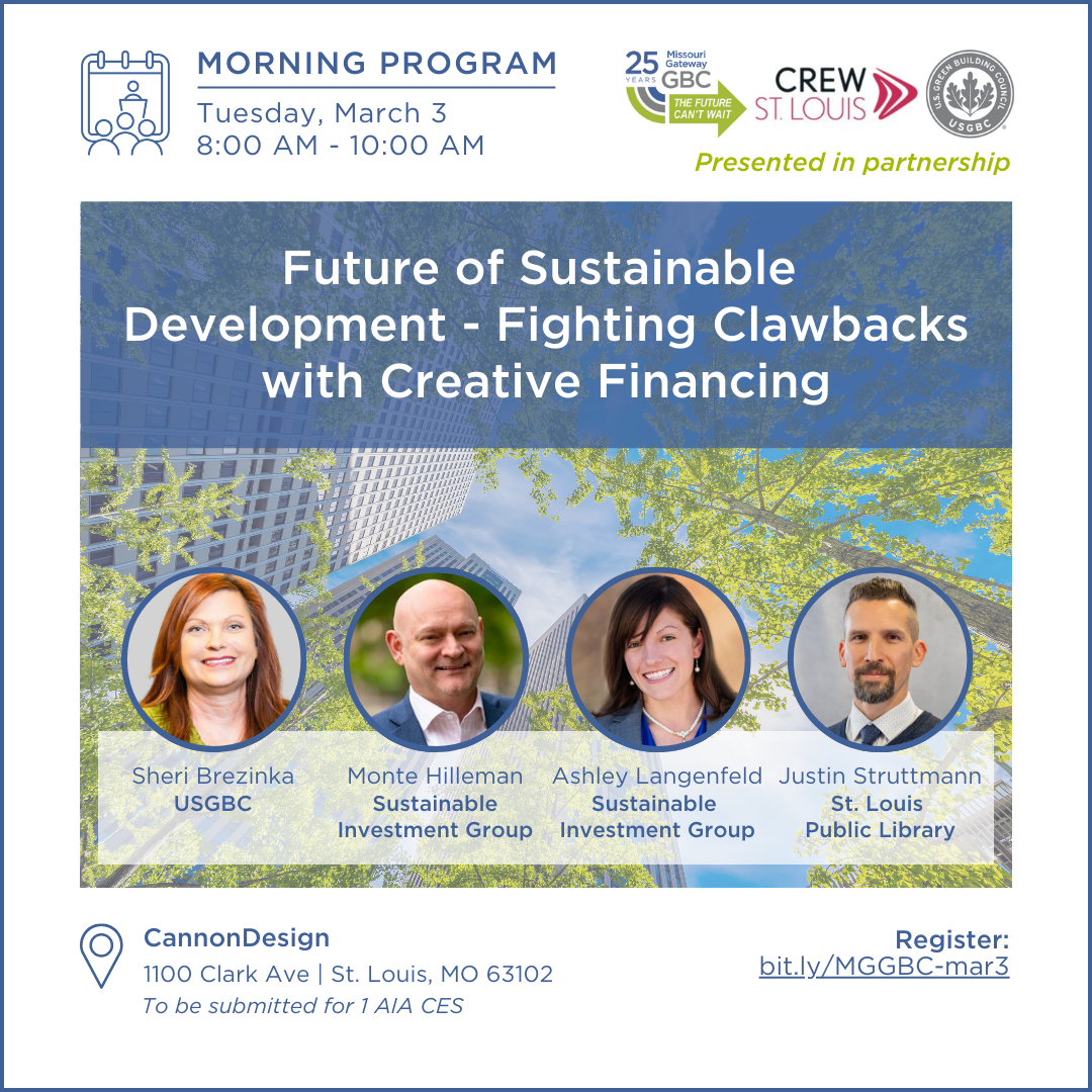 Join us for a joint program with CREW-St. Louis and U.S. Green Building Council to for an engaging discussion on the evolving landscape of sustainable development and green building.